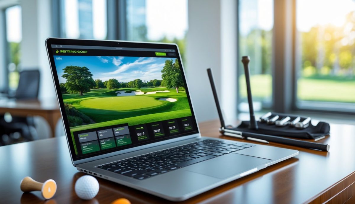 Meja dengan laptop yang menampilkan lapangan golf, bola golf, tee golf, dan stik golf di ruangan kantor yang terang.
