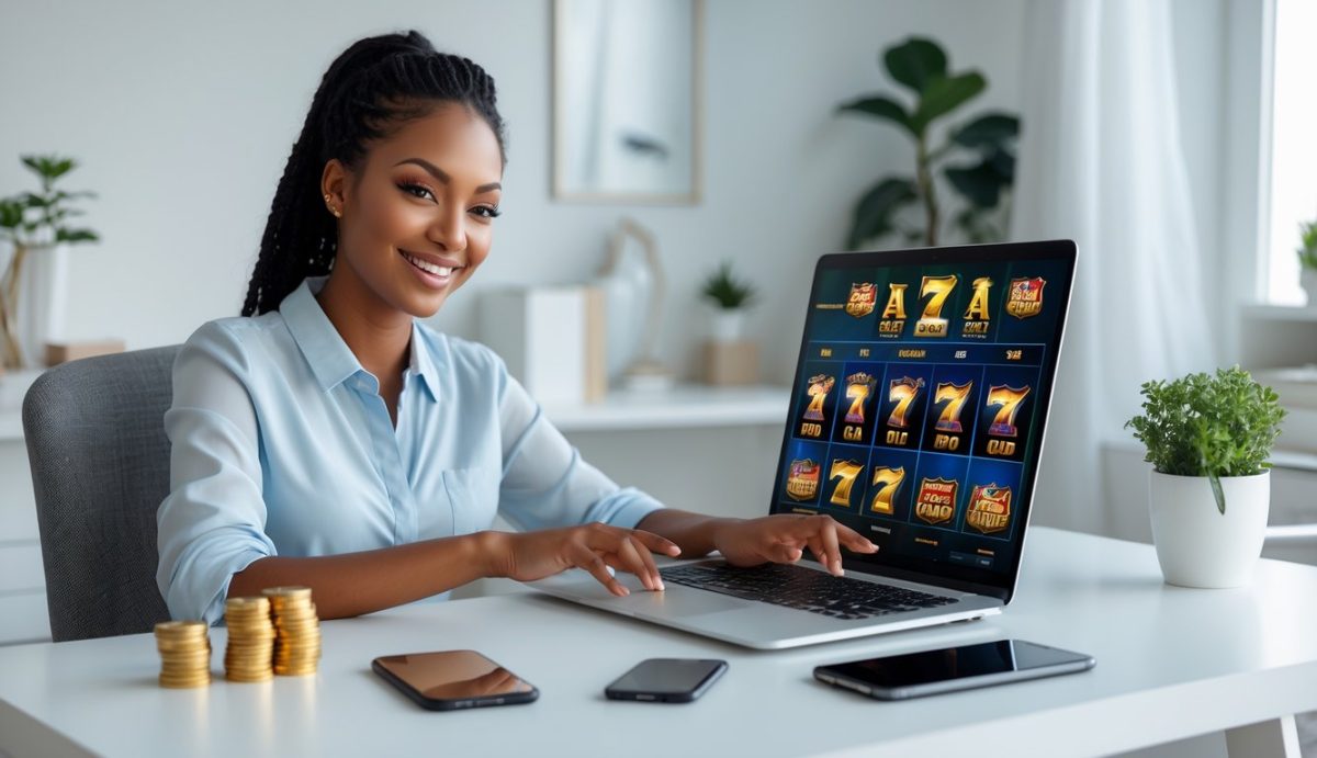 Seorang dewasa muda duduk di meja dengan laptop yang menampilkan permainan slot online, di ruang kerja rumah yang terang dan rapi.