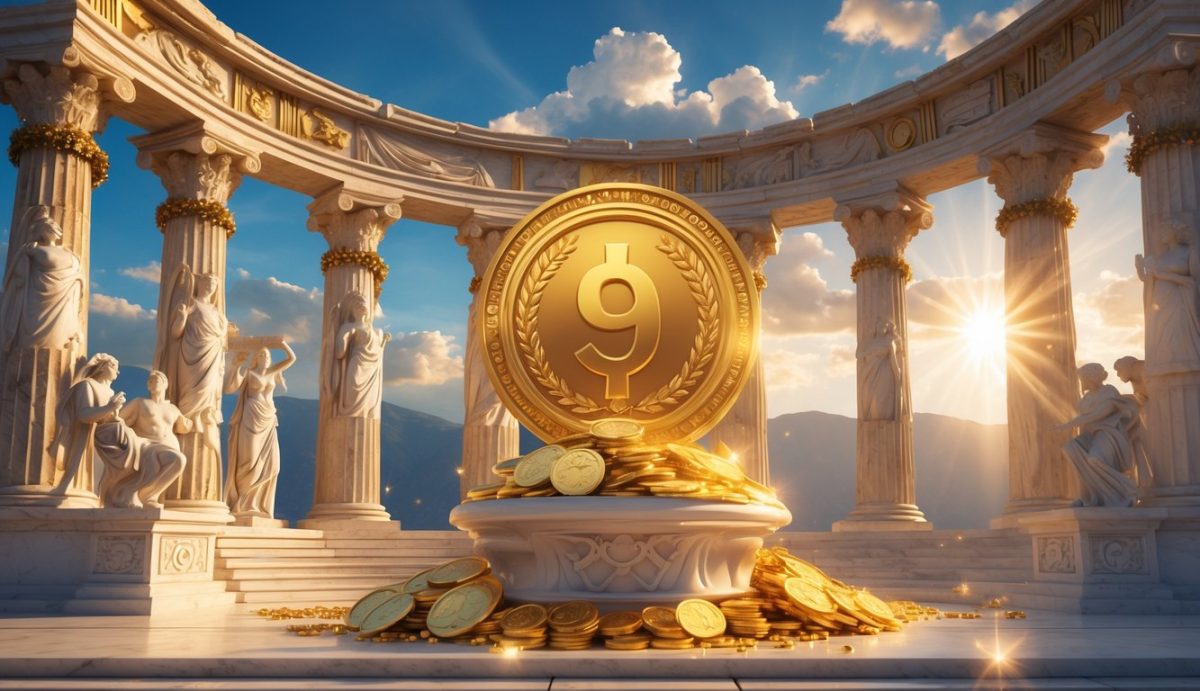 Pintu gerbang kuil Yunani kuno yang megah dengan koin emas besar dan permata di sekitarnya di bawah langit cerah.
