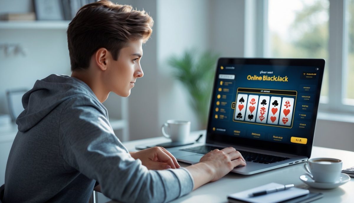 Seorang dewasa muda duduk di meja modern menggunakan laptop untuk bermain blackjack online dengan suasana yang aman dan nyaman di ruang kerja rumah.